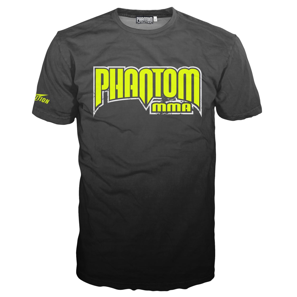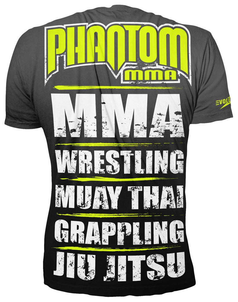 mit Phantom MMA Schriftzug auf der Vorderseite und Phantom MMA, MMA, Wrestling, Muay Thai, Grappling und Jiu Jitsu Schriftzügen auf der Rückseite