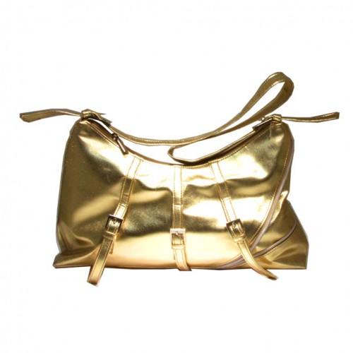 Goldfarbene Handtasche mit Reissverschluss und Tragriemen.