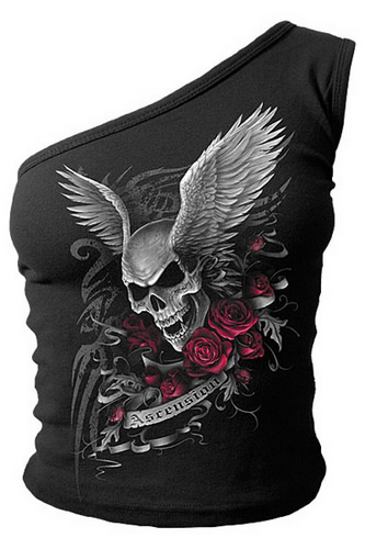 Schwarzes OneShoulder Top mit geflügeltem Vamp-Skull und roten Rosen