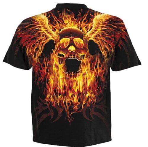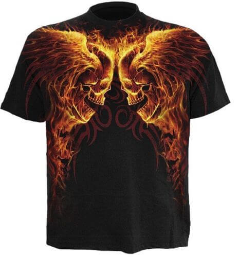 Schwarzes T-Shirt mit brennenden Totenkopfen.