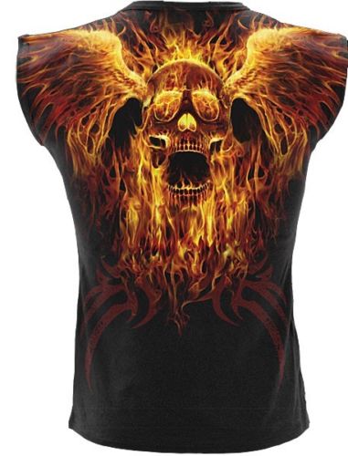 Schwarzes ärmelloses Shirt mit brennenden Totenkopfen.