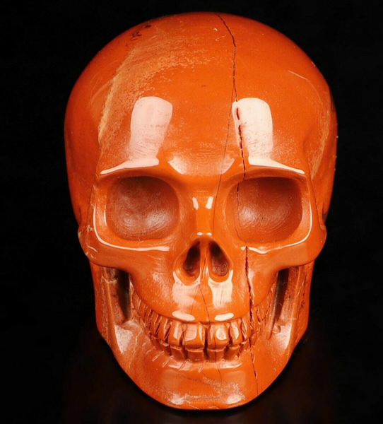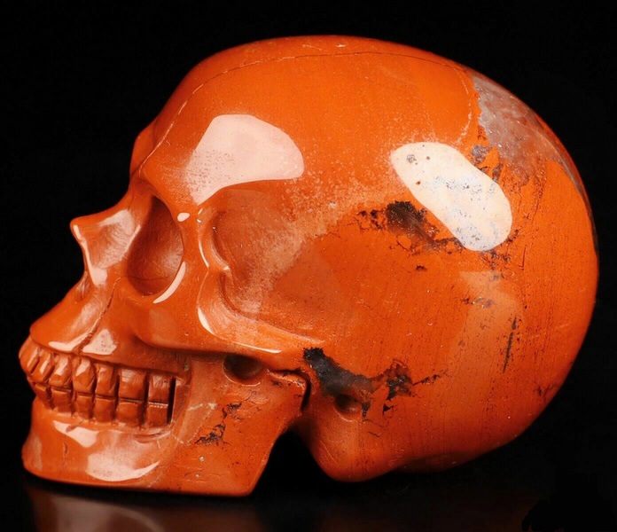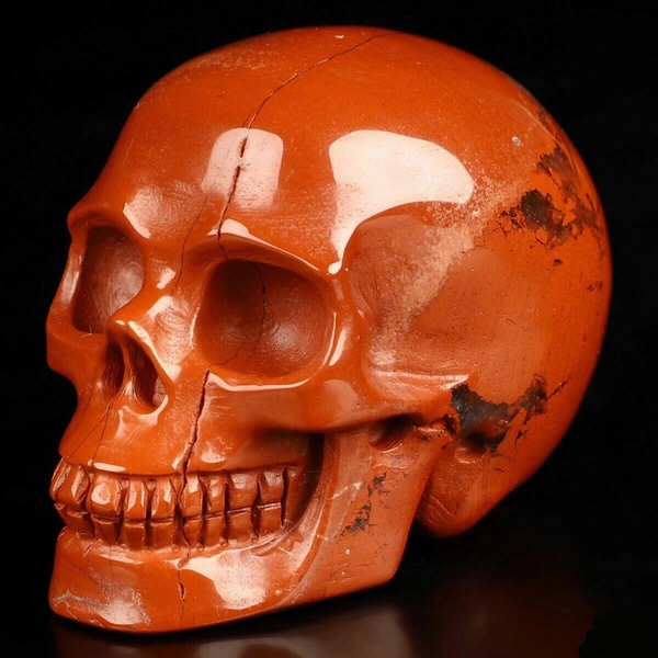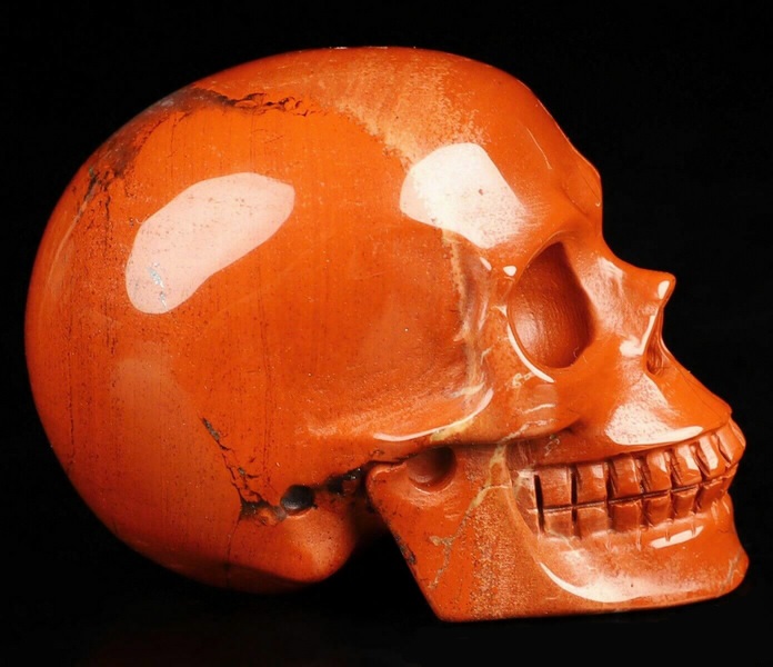Schön detaillierter roter Jaspis Schädel mit weisser und schwerzer Adermusterung