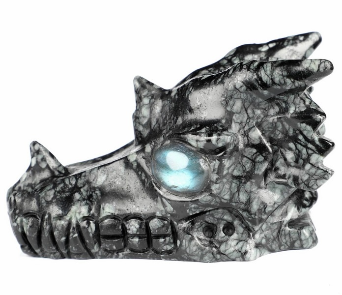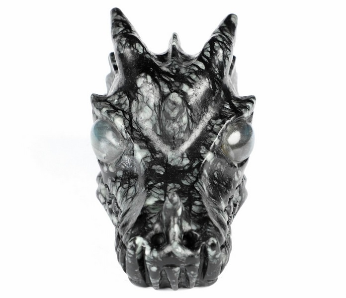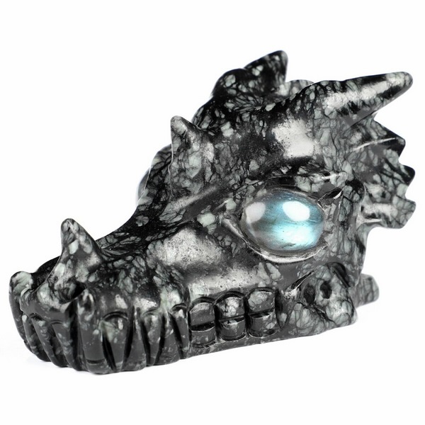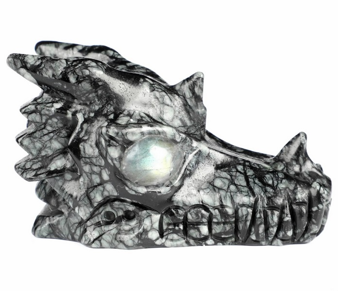 Schön detaillierter Picasso Jaspis Drachenkopf mit schimmernden Augen aus Labradorit fein poliert Grösse: ca. 98 x 53 x 55 mm Gewicht: ca. 317g Material: Drachenkopf: Picasso Jaspis Augen: Labradorit