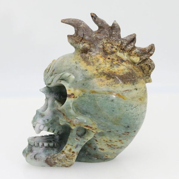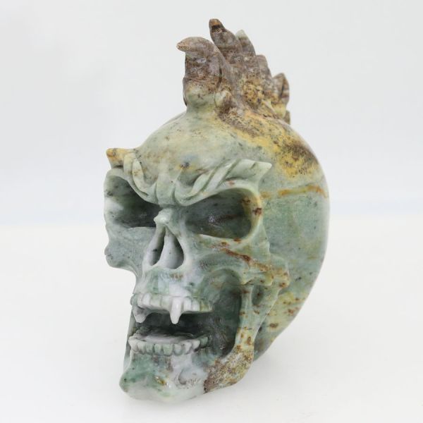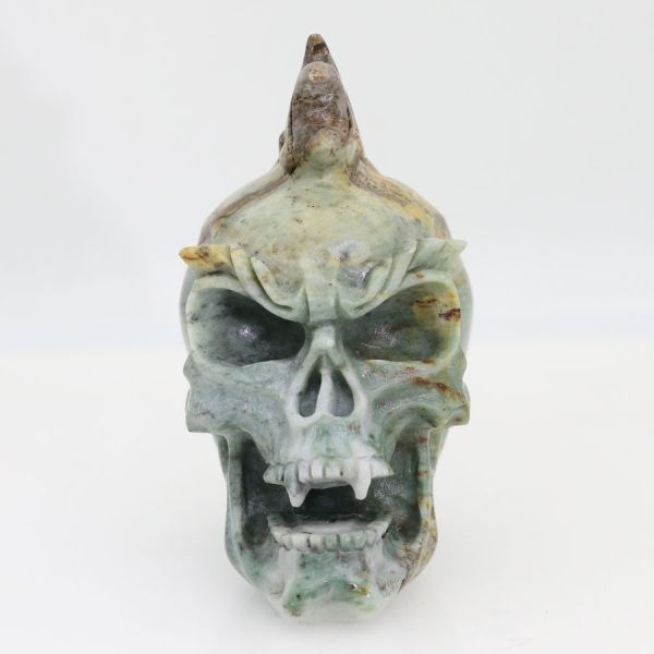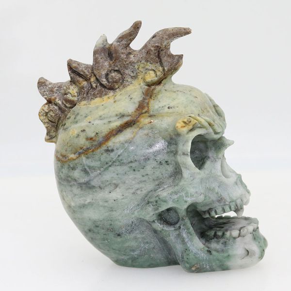 Schön detaillierter Skull mit Irokesenkamm aus geschnitztem grünen Jaspis.
