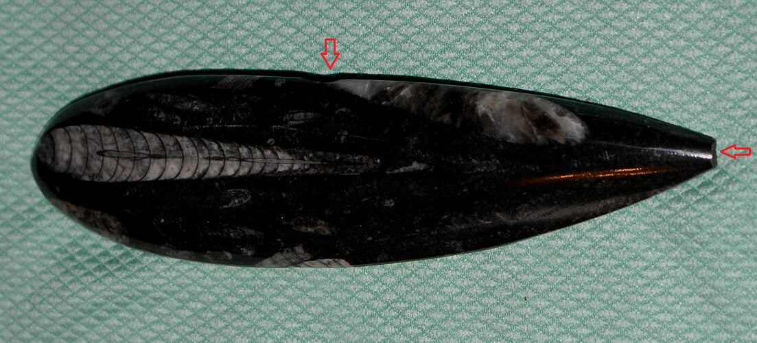 der Ortoceras hat auf der linken Seite eine Delle (poliert) und die Spitze ist abgebrochen (siehe 2tes Bild rote Pfeile)