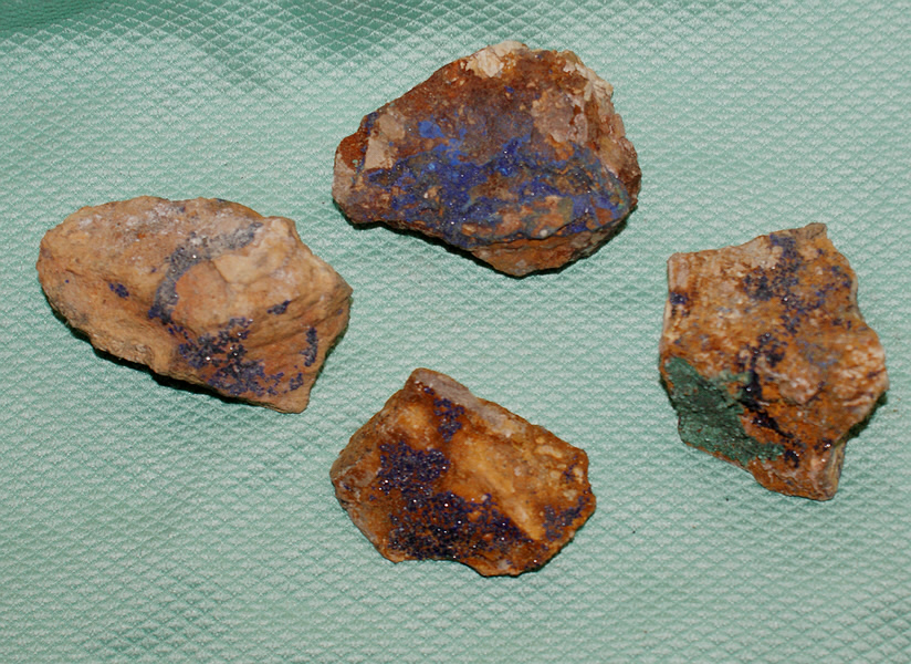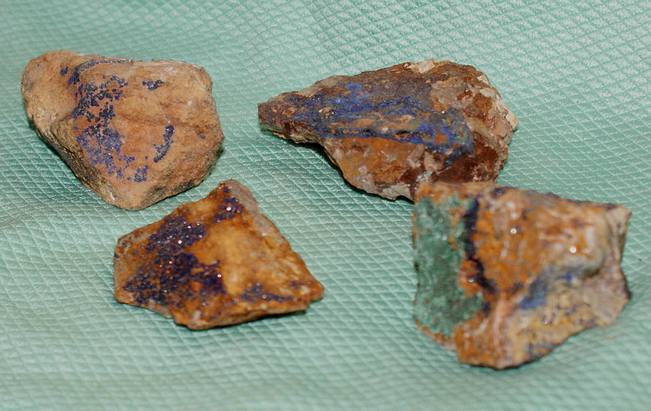 Vier Steine verschiedener Grösse mit Azurit (blau) und ein Stein mit zusätzlich noch Malachit (grün)