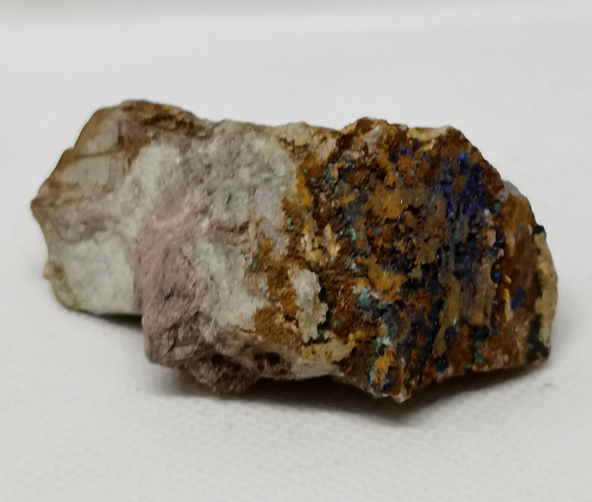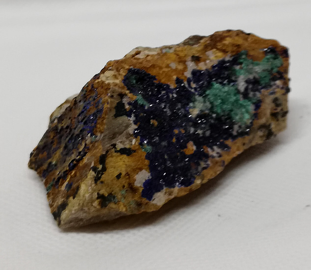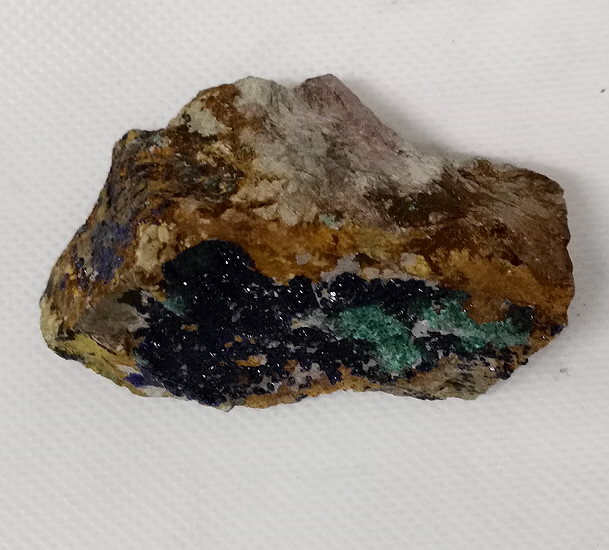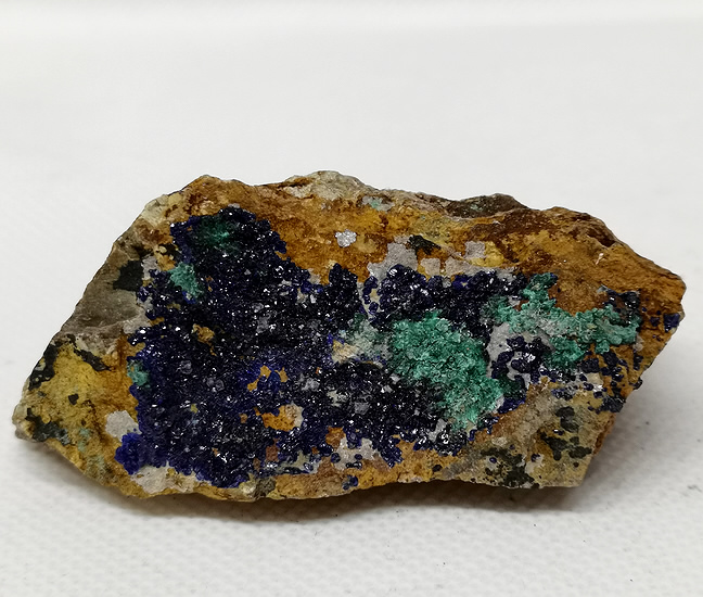 kleine, leuchtende Azurit und Malachit Kristalle auf Erzgestein