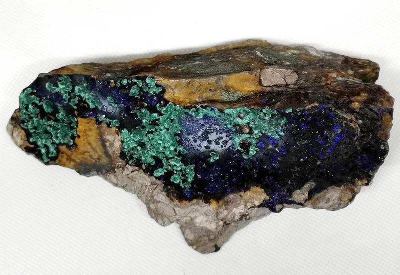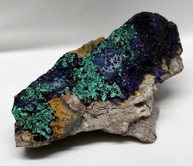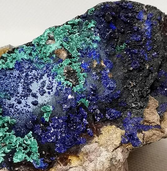 kleine, leuchtende Azurit und Malachit auf Erzgestein, aus Marokko