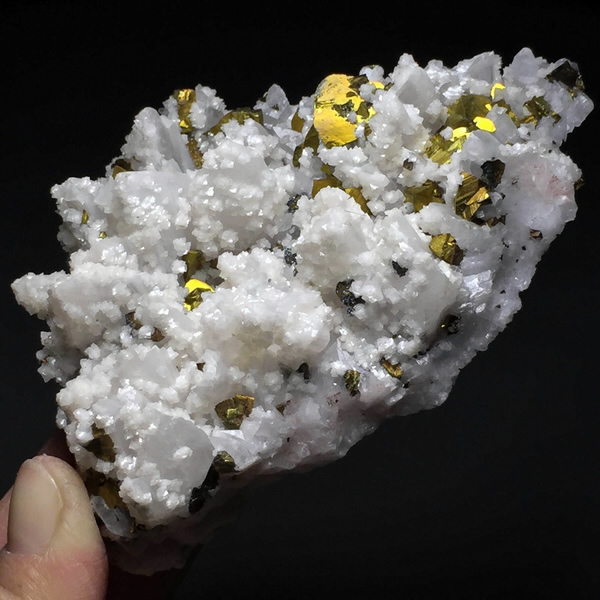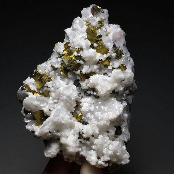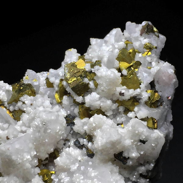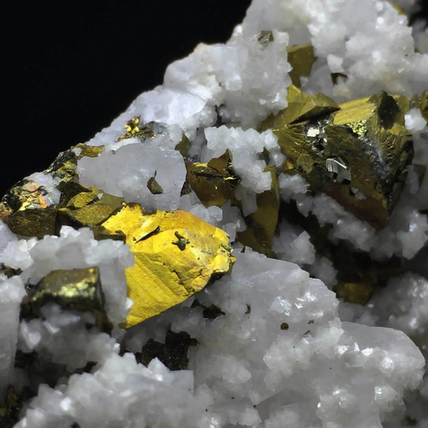 glitzernde Regenbogen-Pyrit und Triangel Kupfer Einschlüsse in weissem Dolomit mit Bergkristall.