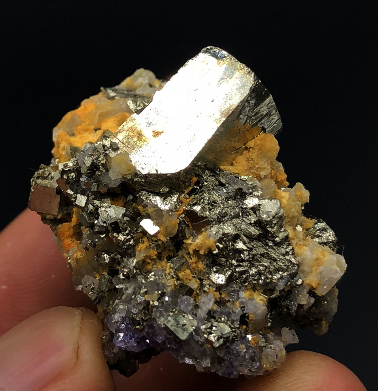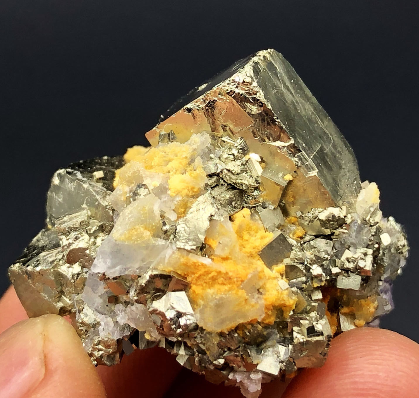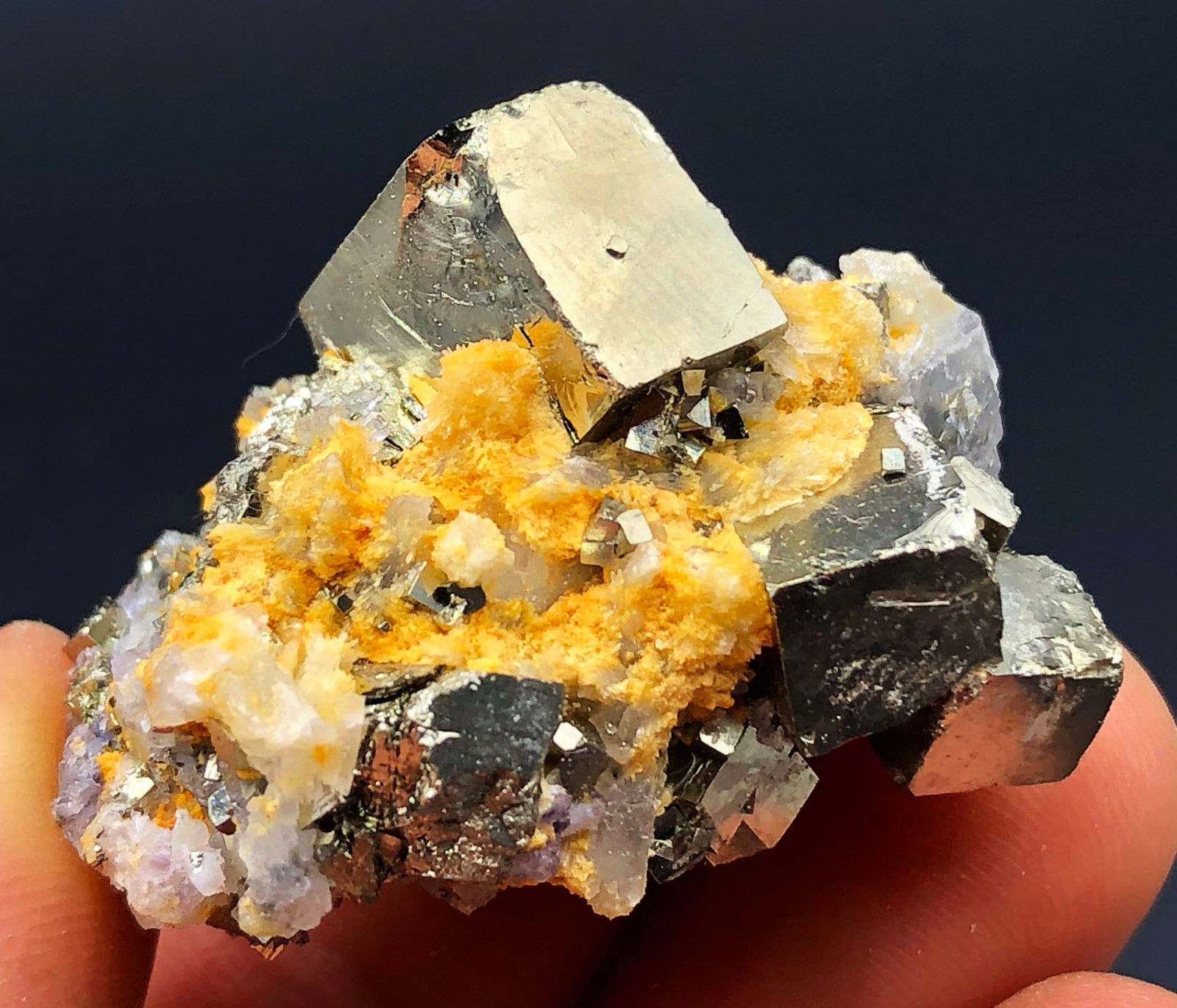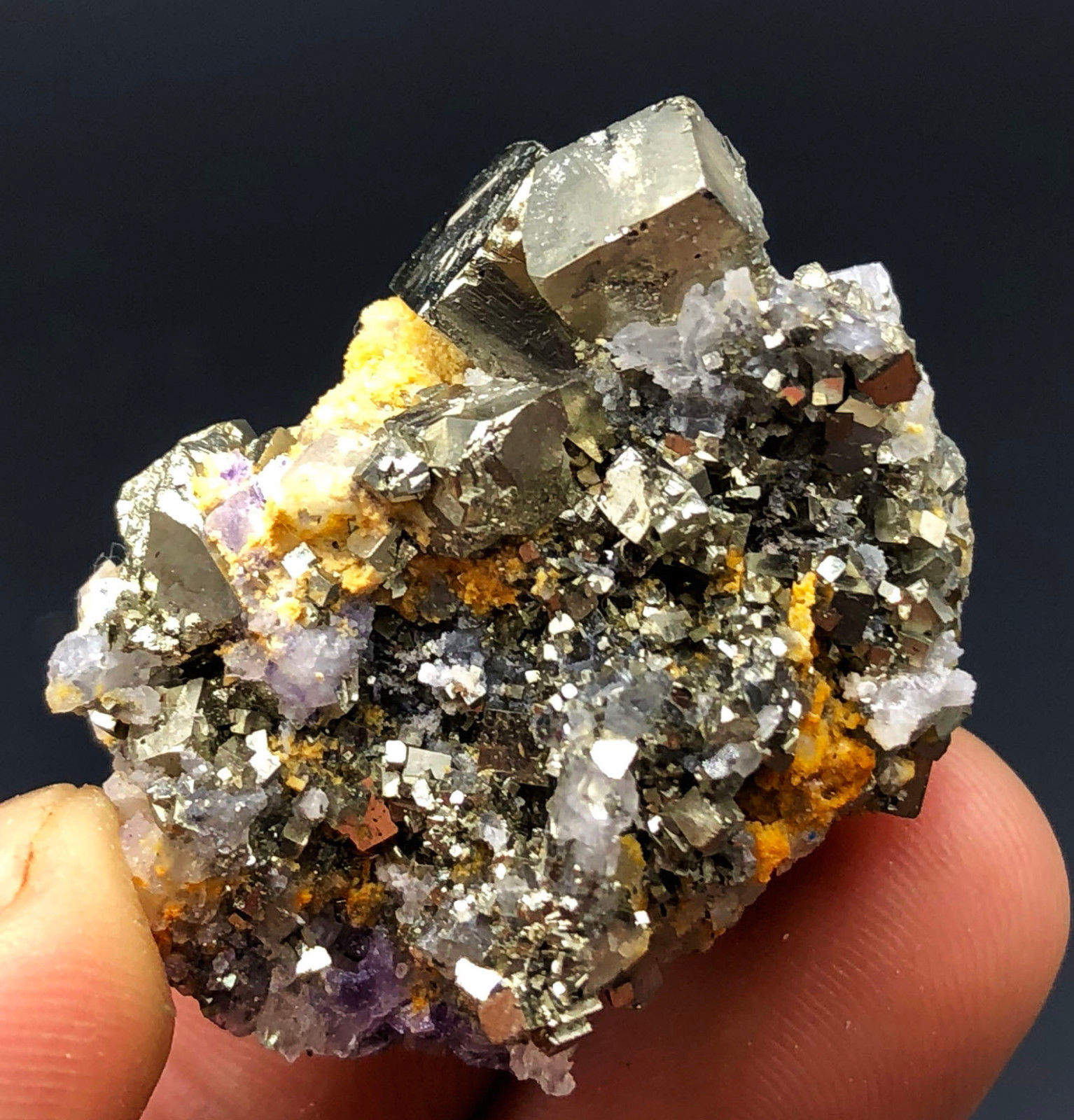 Pyrit Stufe mit vielen verschieden grossen Pyrit Würfeln und ein wenig Calcit Kristallen und violetten Fluorit