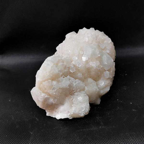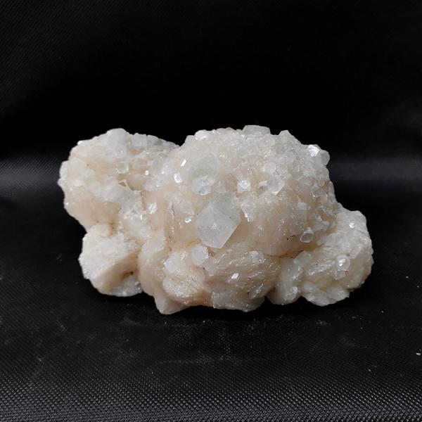 dieser Zeolit ist eine Kombination aus Stilbit (beige, cremefarbene blättrige Grundmasse) und Apophyllit (klare, prismatische oder würgelförmige Kristalle)
