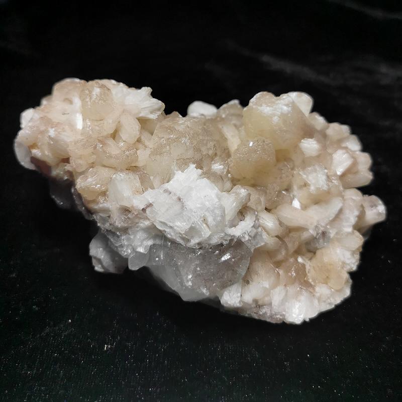 dieser Zeoilit-Stein besteht aus Scolecit (weisse, nadelige, blattartige Kristalle) mit einigen Calcit-Begleitkristallen (glasig, optisch ähnlich Bergkristall)