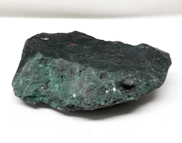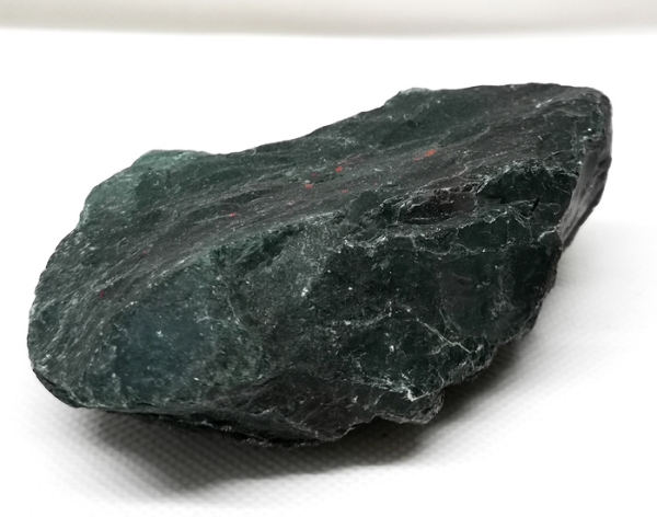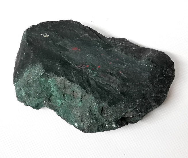 Grüner Heliotrop Rohstein mit feinen roten Inklusen.