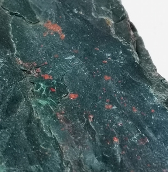 Heliotrop wird oft auch als Blutjaspis bezeichnet und können Inklusen von rot bis gelbbraun enthalten.