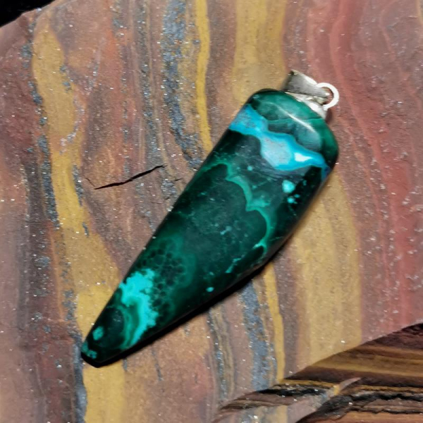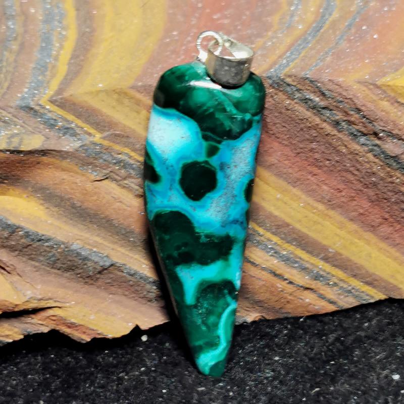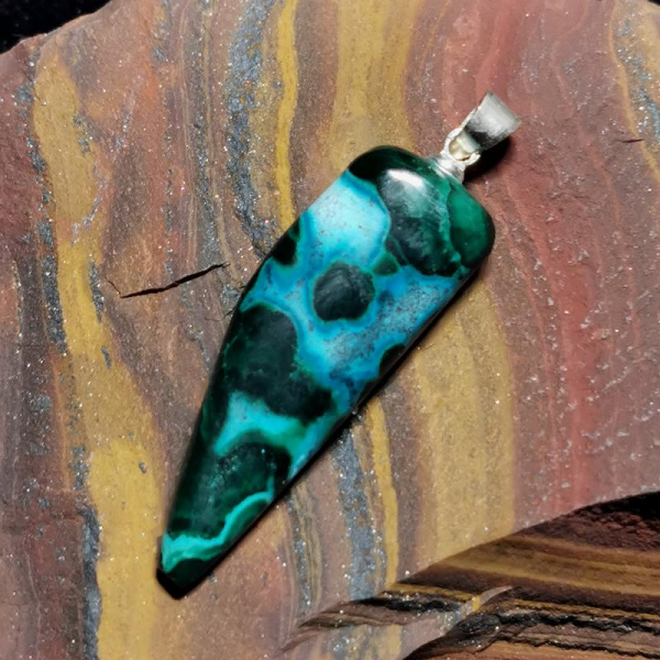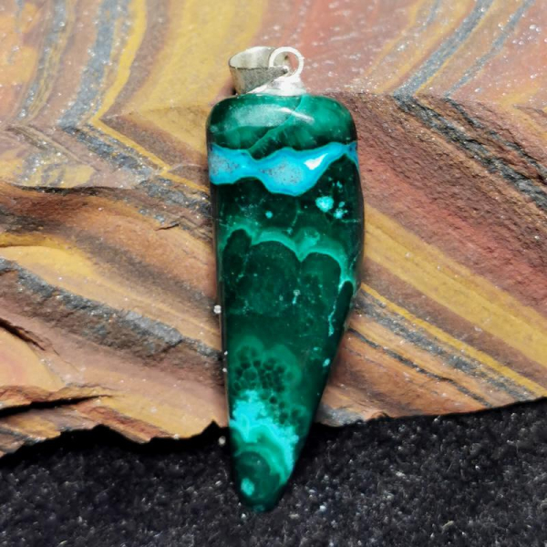 Dieser Anhänger besteht aus echtem Malachit–Chrysokoll, einem faszinierenden Kupfermineral mit intensiven Türkis- und Grüntönen.