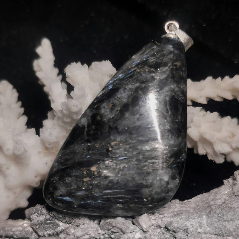 Anhänger Nuummit mit den typischen Anthophyllit/Gedrit und Pyrit/Pyrrhotin/Chalkopyrit Einschlüssen