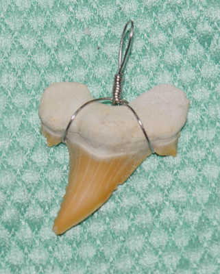 Echter,fossiler, versteinerter Haifischzahn mit einem Drahtanhänger