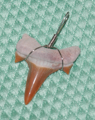 Echter,fossiler, versteinerter Haifischzahn mit einem Drahtanhänger