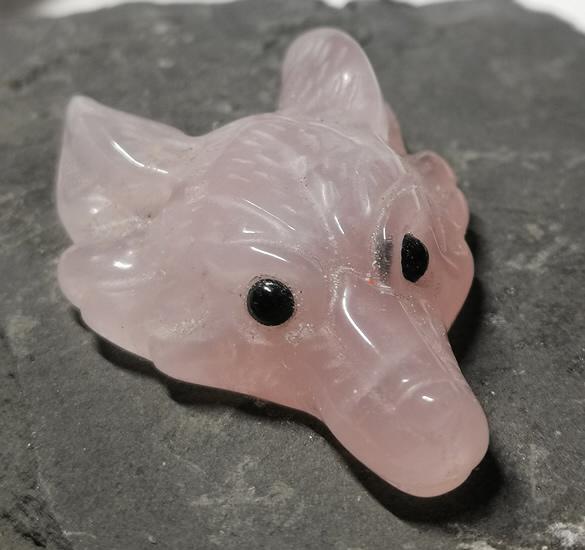 Wolfskopf Rosenquarz Anhänger mit Onyx Augen