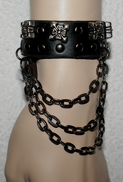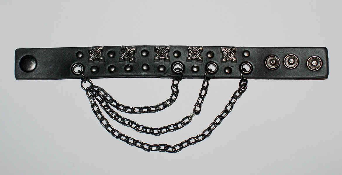Schwarzes Lederarmband mit Nieten, Ösen und Ketten