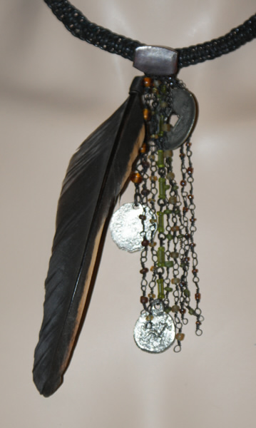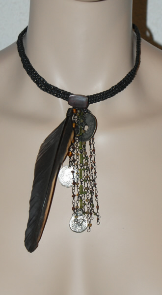 Material: Leder, Feder, Metall, Glasperlen