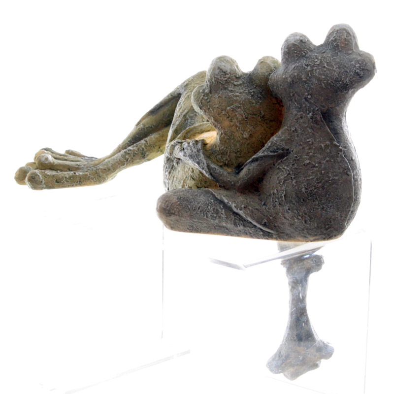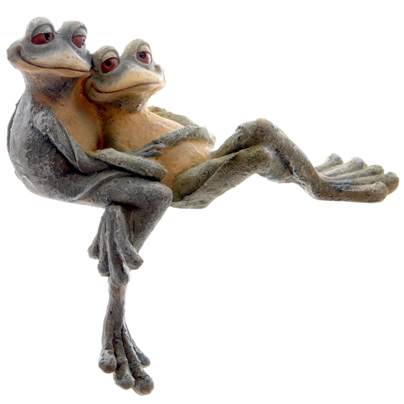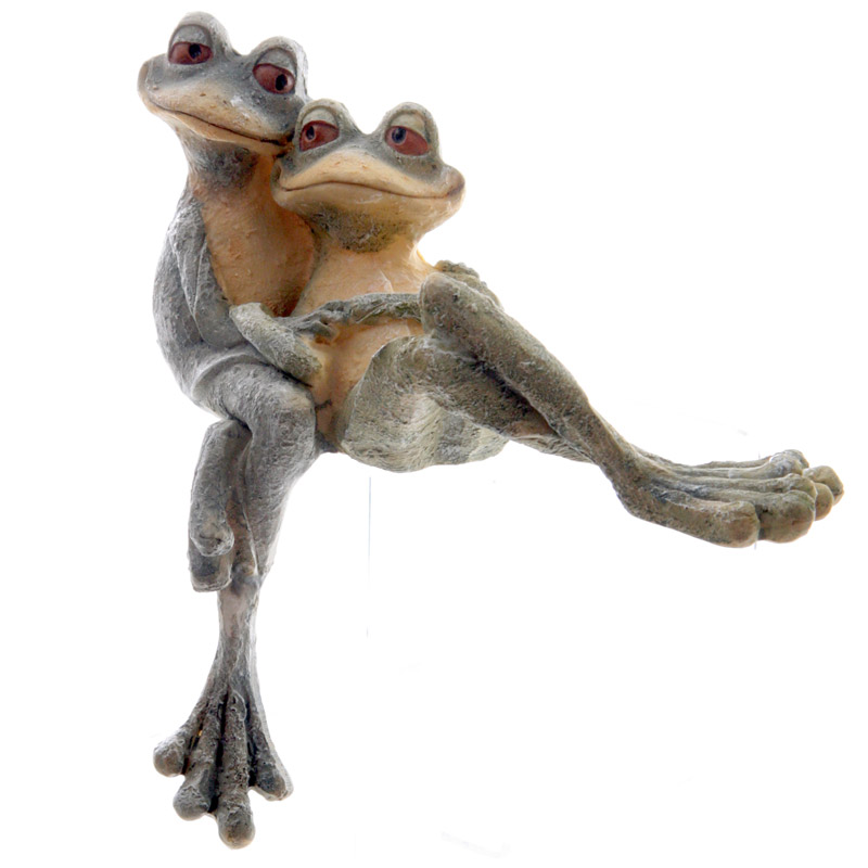 Jeder langbeinige Gartenfrosch besteht aus Resin und wurde im Cartoonstil gestaltet.